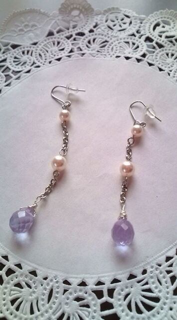 通す光によって微妙に色が変わるドロップカットのビーズとスワロパールを使用した清楚なピアスです。