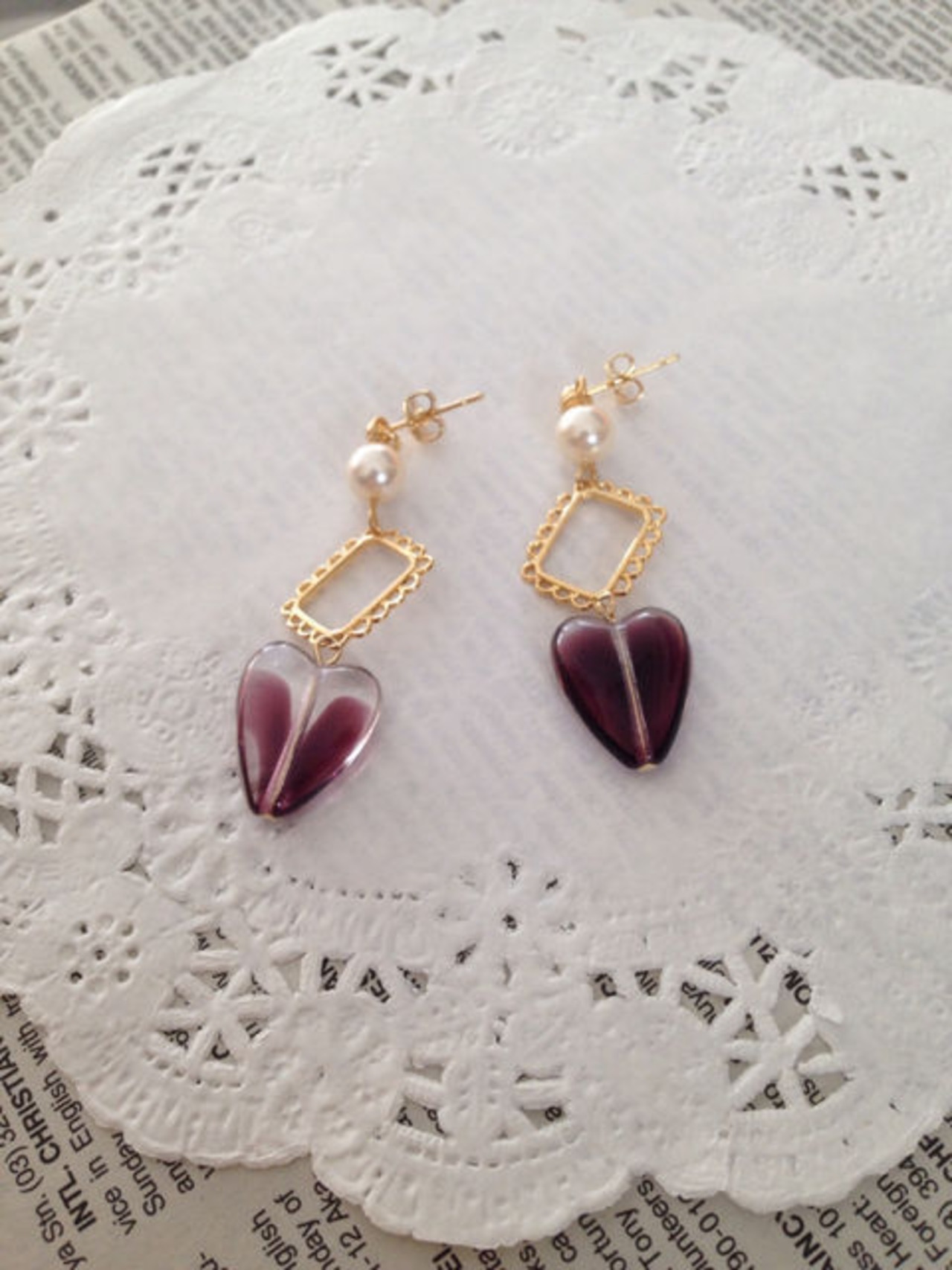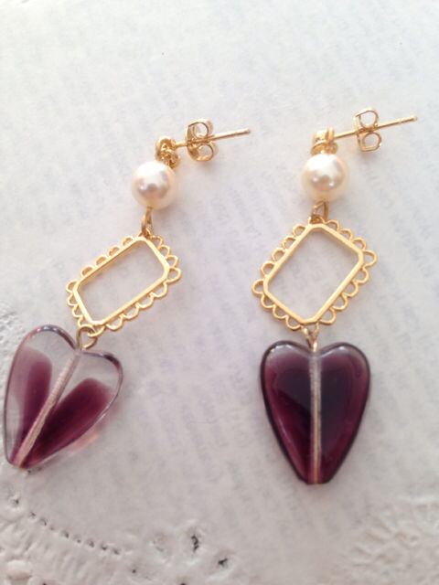 スワロフスキーパールと、つるんとしたハート型のチェコビーズの間には長方形のフレームのようなチャームを使用した、大人可愛いイヤリングになりました。
