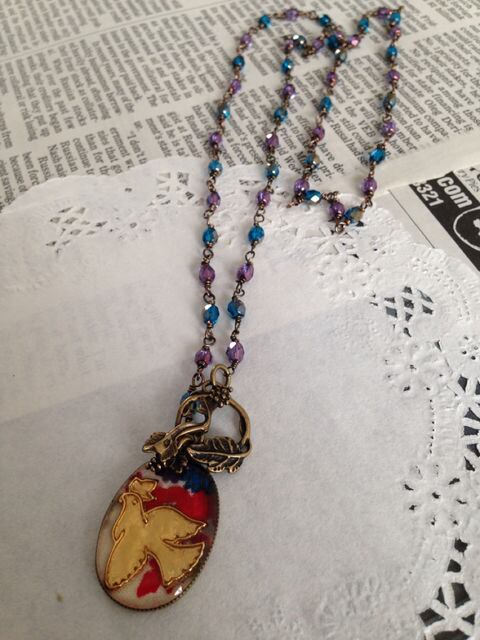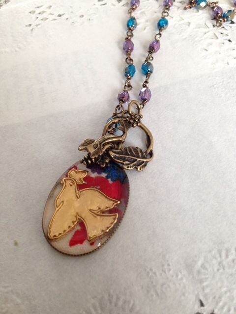 葉をくわえた鳩のモチーフをフランス製ビンテージ生地と一緒にクリスタルレジンに閉じ込めました。