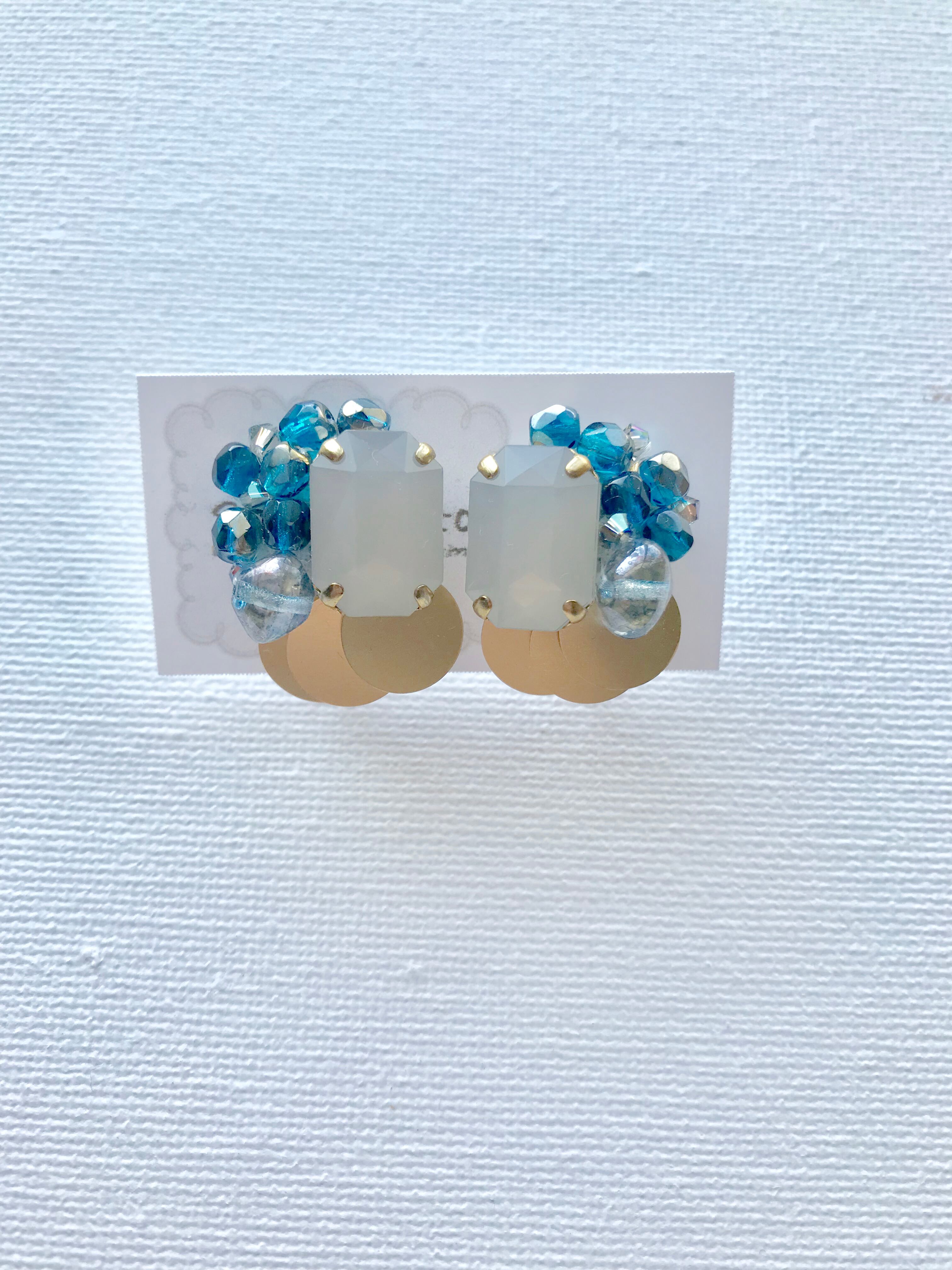 鱗のようなゴールドのスパンコールと、鮮やかなブルーのチェコビーズが印象的なイヤリングです。