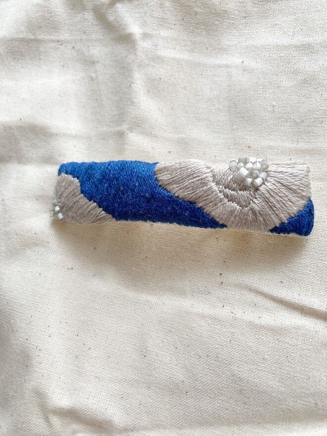 群青色と灰色の花を大きく切り取ったような絵柄をバレッタにしてみました。