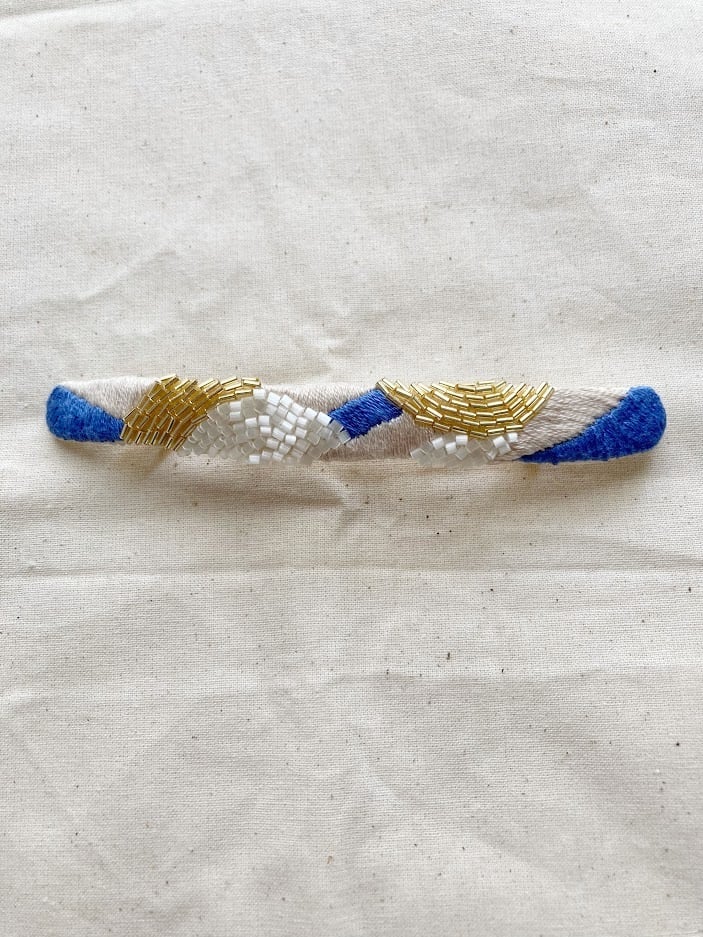 薄桃色と群青色をベースに、その中にゴールドとパールホワイトのビーズを刺繍した、華やかなロングタイプのバレッタです。