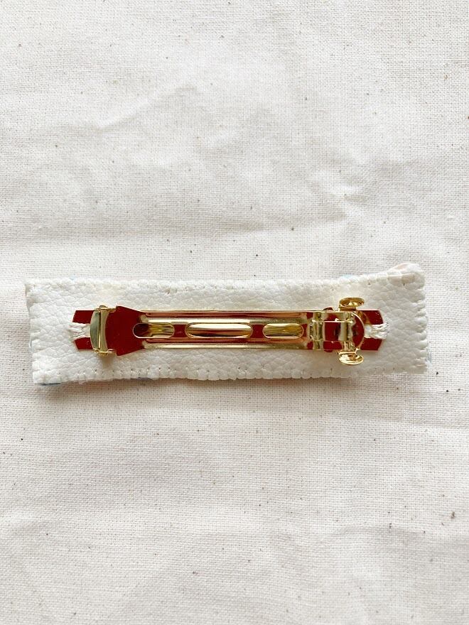 シンプルな形ですが、刺繍ならではの糸の艶が映えるバレッタです。