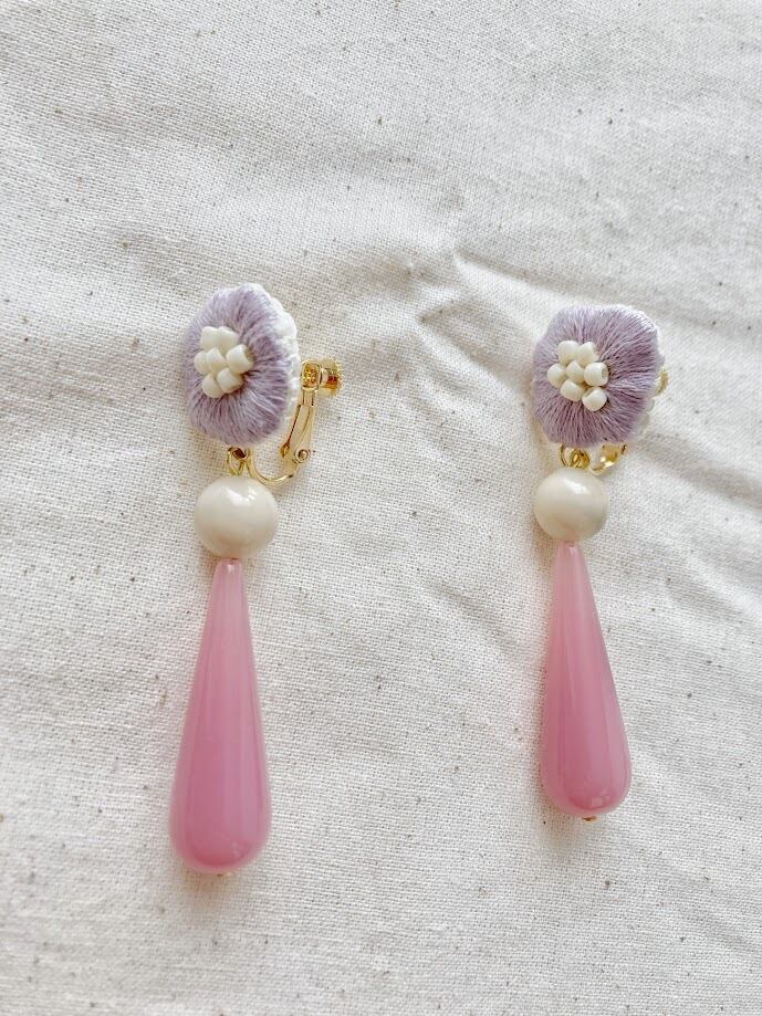 フリーハンドで描いた花を刺繍で仕立てたイヤリングです。